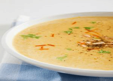 - تقدم الشوربة مع شرائح الخبز الفرنسي المحمصة.